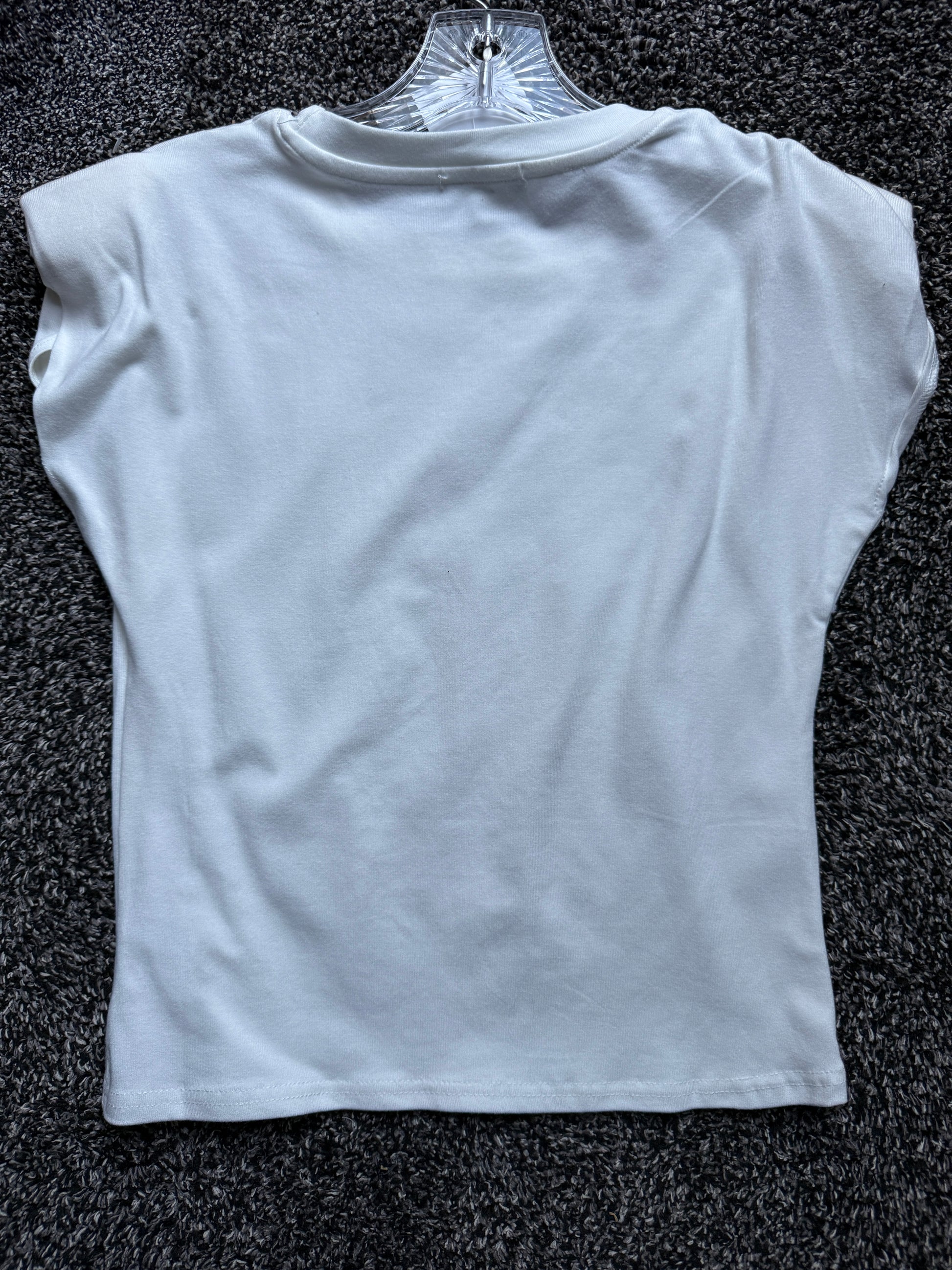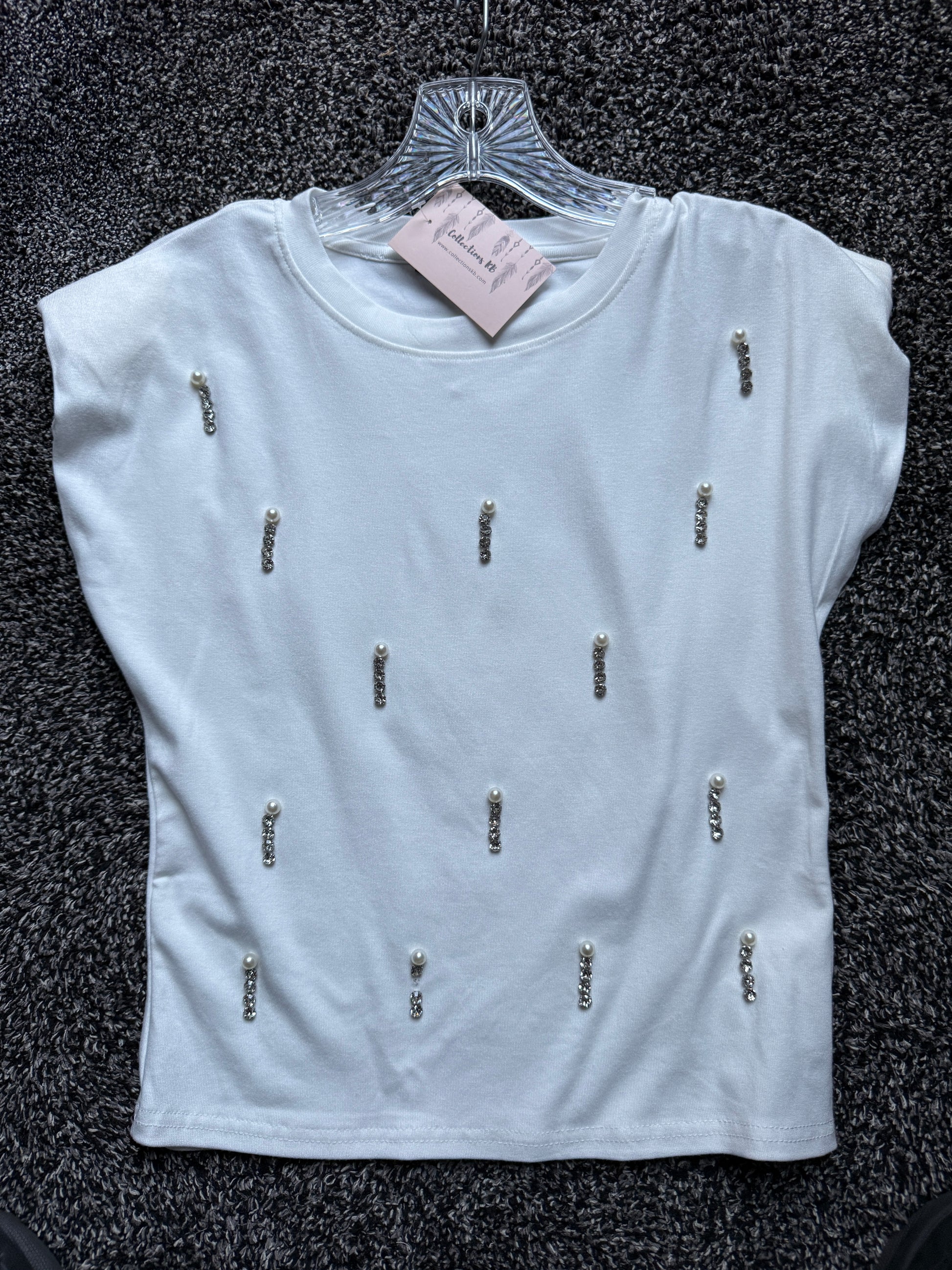 Cotton top that has pearl with rhinestone.