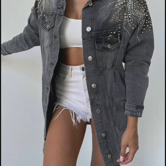 Making this piece, be a statement jacketMake a statement with our Denim Rhinestone Jacket. This black denim jacket features sparkling rhinestones on both shoulders, adding just the right amount of bling. With its oversized fit in shoulder area, it's perfect for making a bold fashion statement. Elevate your wardrobe with this one-of-a-kind piece.